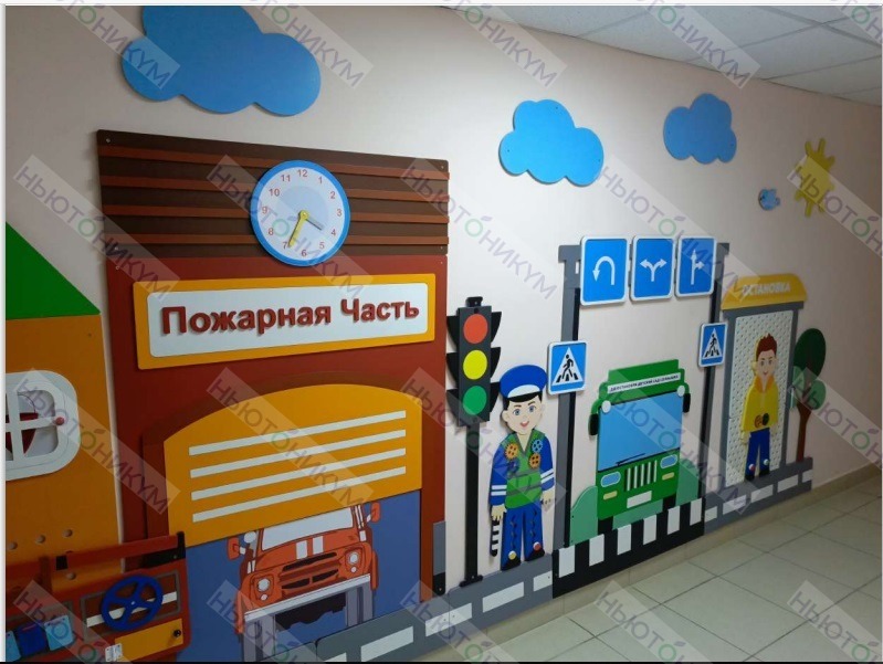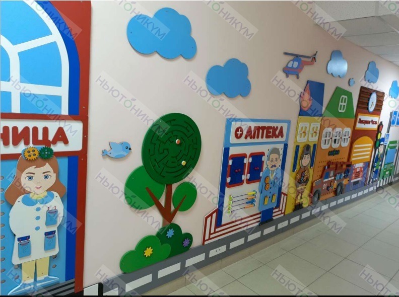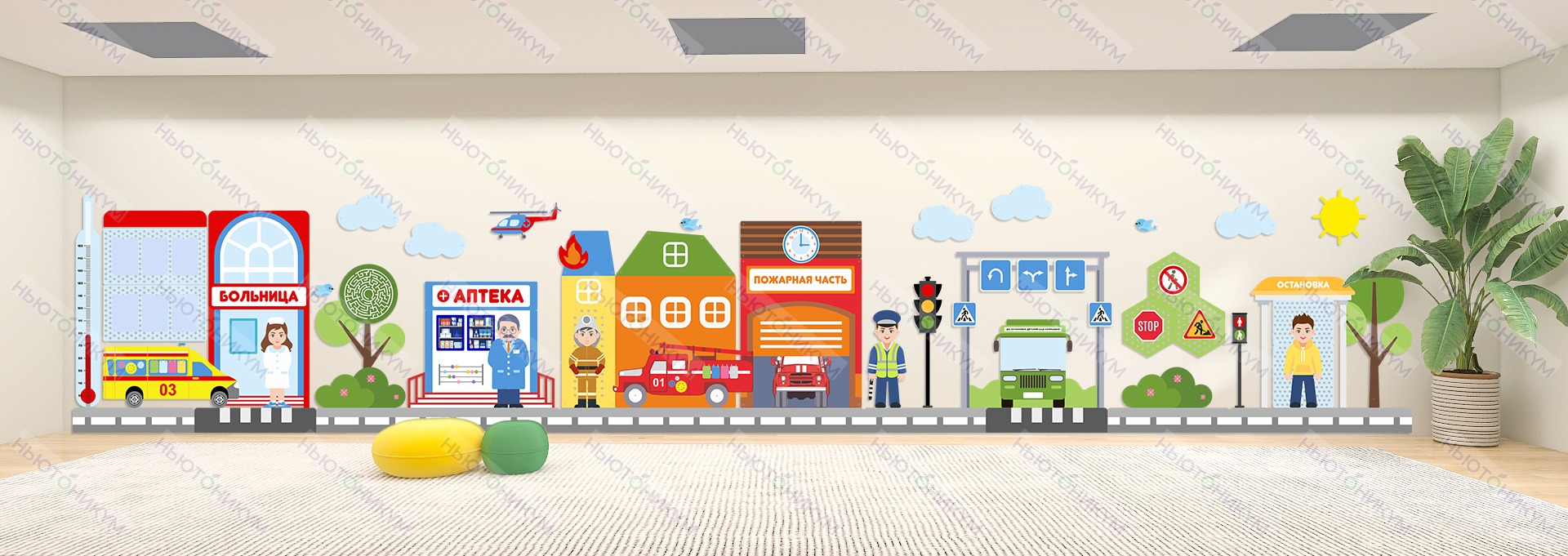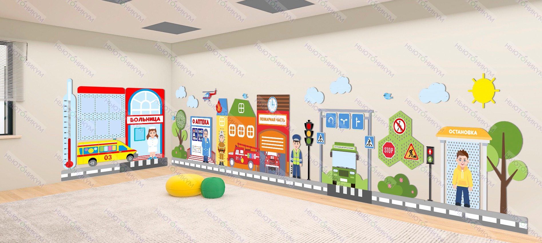 Панель выполнена в стилистике городской среды для изучения разных профессий для ДОУ.