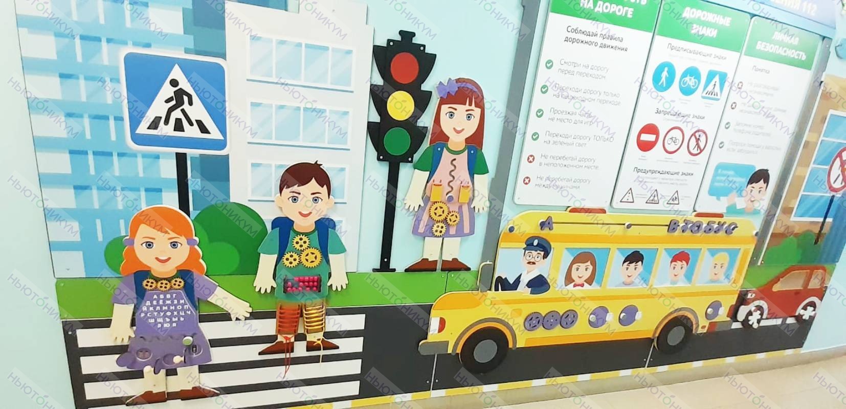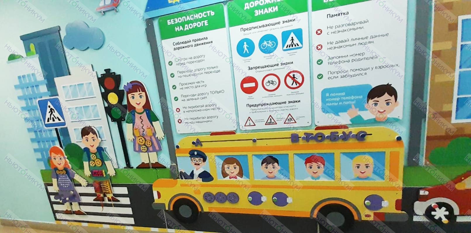 Панель выполнена в стилистике городской среды для изучения правил дорожного движения и поведения на дороге.