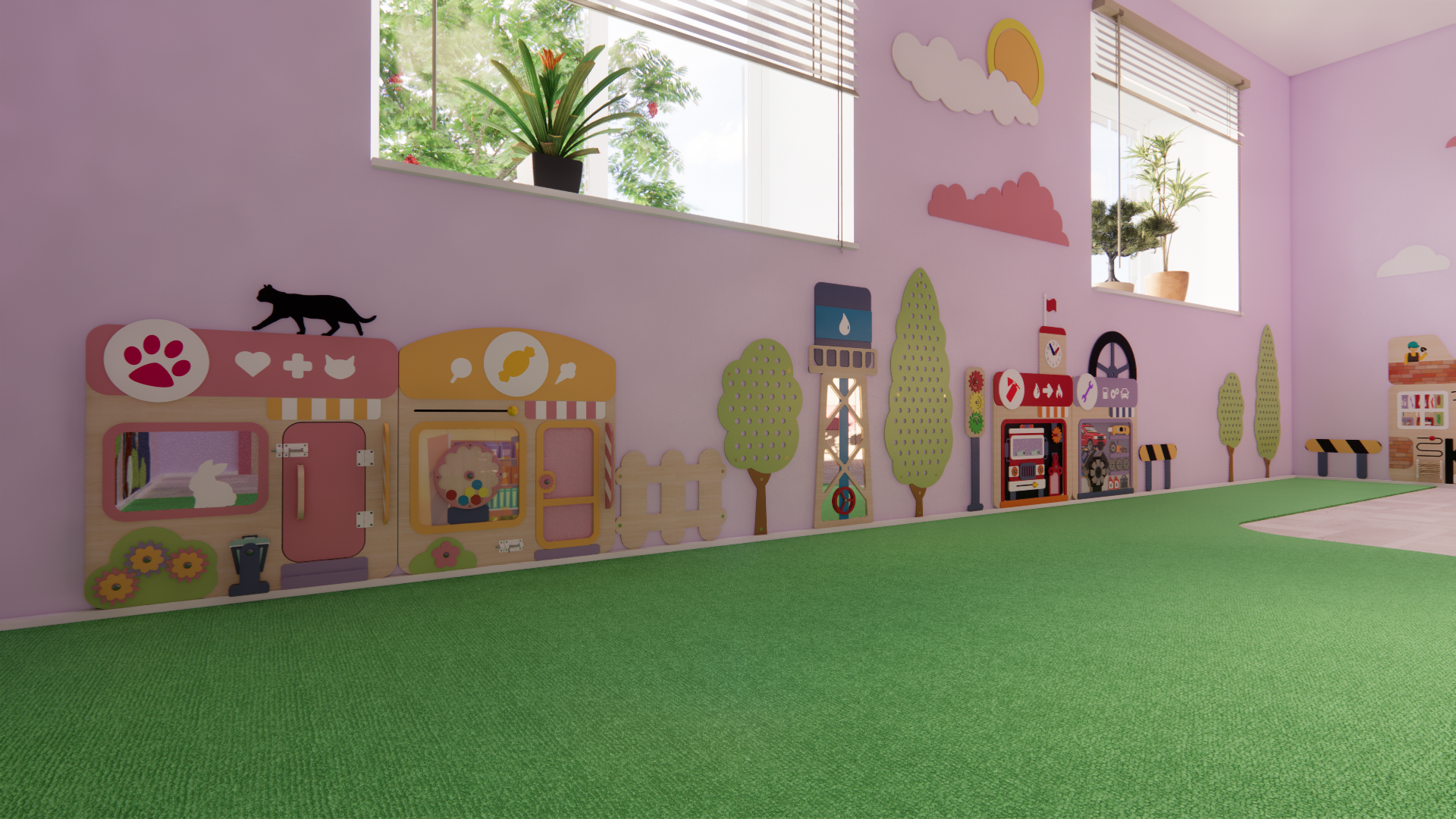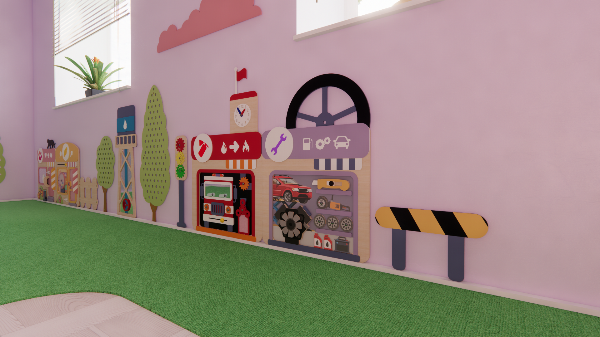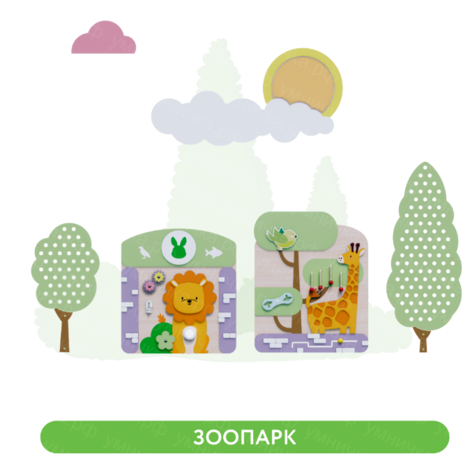 Панели состоят из игровых модулей с подвижными элементами для развития познавательных процессов у малышей. Оборудование совершенно безопасно: оно выполнено из гипоаллергенных материалов и не содержит мелких деталей.