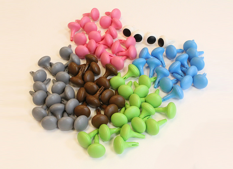 Игровой набор состоит из 64 разноцветных колышек в 6 цветах (розовый, зеленый, голубой, белый с чёрной точкой по центру, голубой, коричневый).