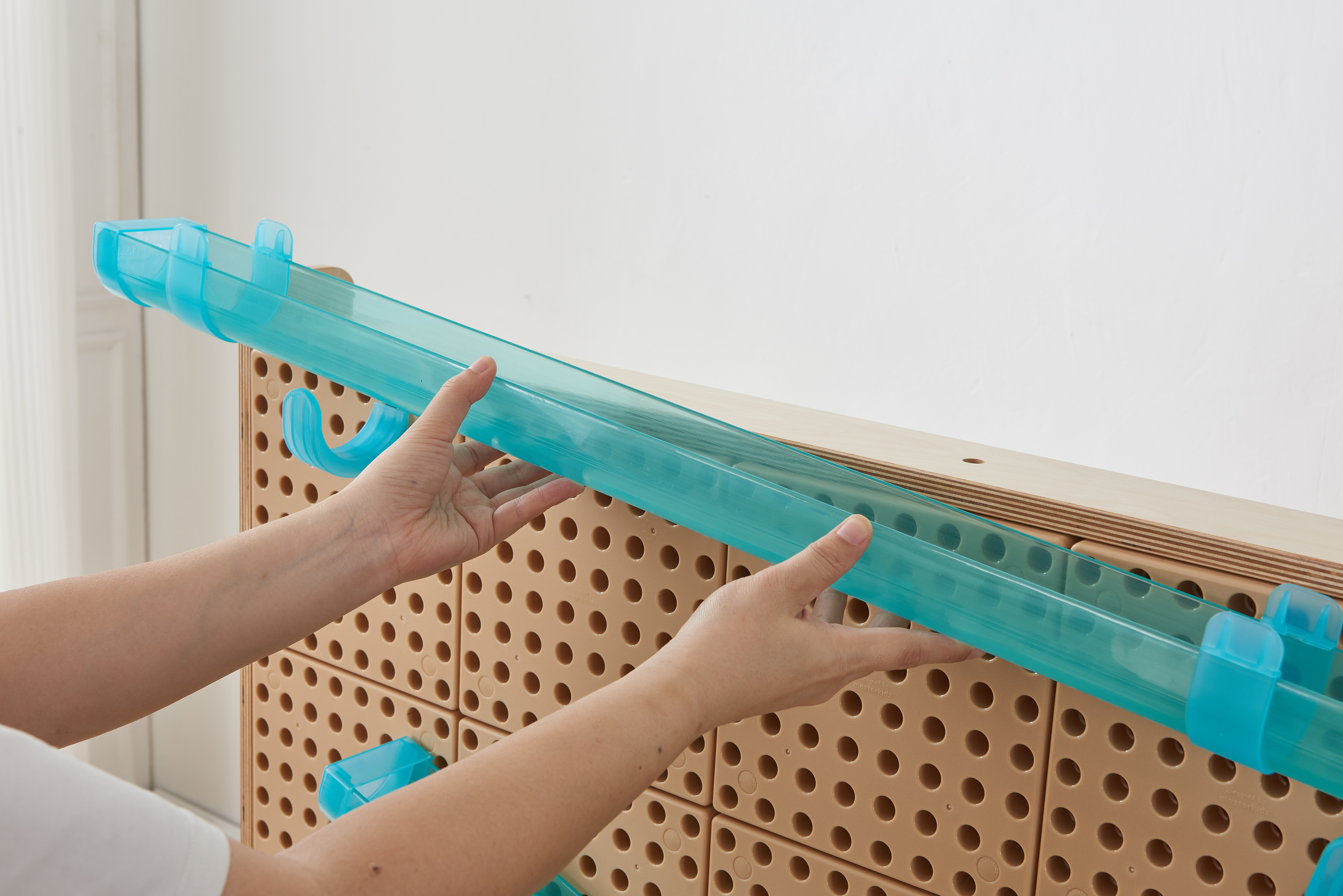 В комплект входят желоба разной длины, разноцветные шарики и набор для крепления к STEM-стене, а также различные компоненты, которые сделают путешествие шарика или воды более увлекательным: ветряные мельницы и водяные колёса, заглушки для воды и концевые колпачки, а также большая воронка для сбора воды или запуска шарика