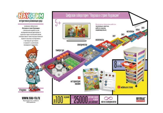 Представляет собой интерактивную детскую цифровую лабораторию «Наураша в стране Наурандии» – нашу уникальную разработку для экспериментальной деятельности в детских садах и начальной школе.